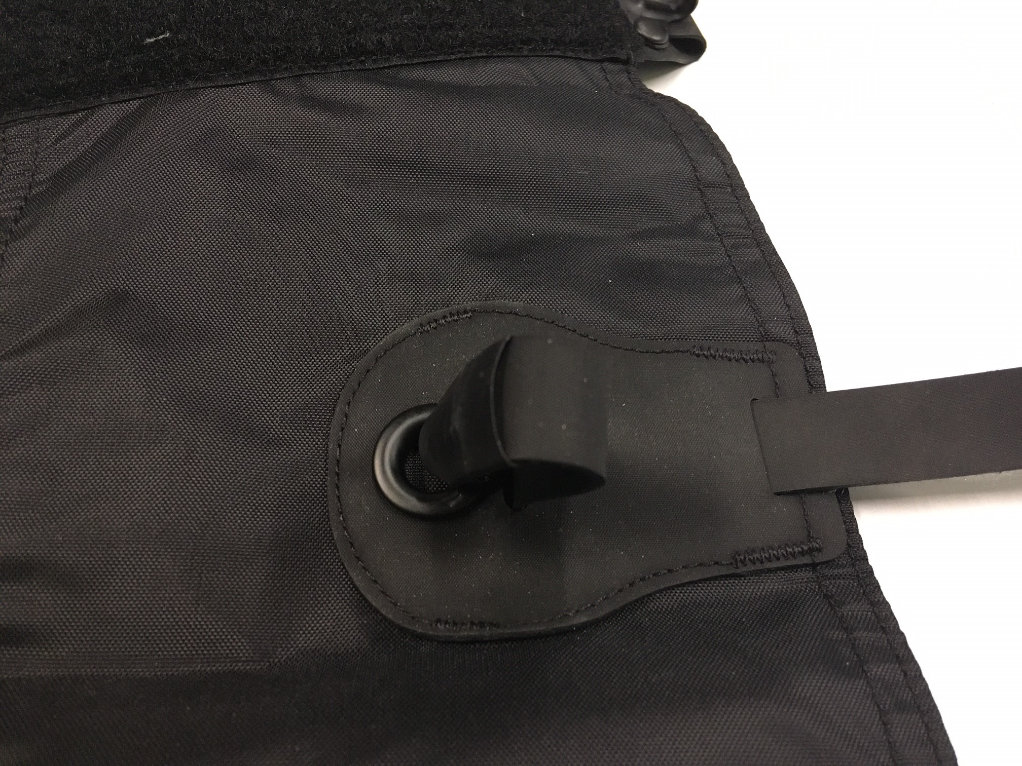 1. The underfoot strap of the ALPINE and QUAGMIRE GAITERS is girth-hitched to an eyelet on one side of the gaiter: