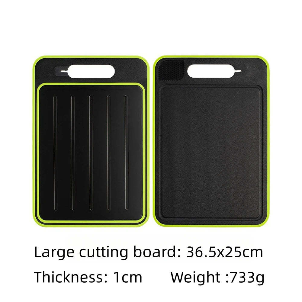 Revolutionize your kitchen with this 4-in-1 cutting board, a versatile solution that combines functionality and innovation. Featuring a double-sided design, it serves as a cutting board on one side and a thaw defrosting tray on the other, making meal prep faster and more efficient. Crafted from food-grade aluminum and durable materials, this board ensures safe food handling and long-lasting use.
