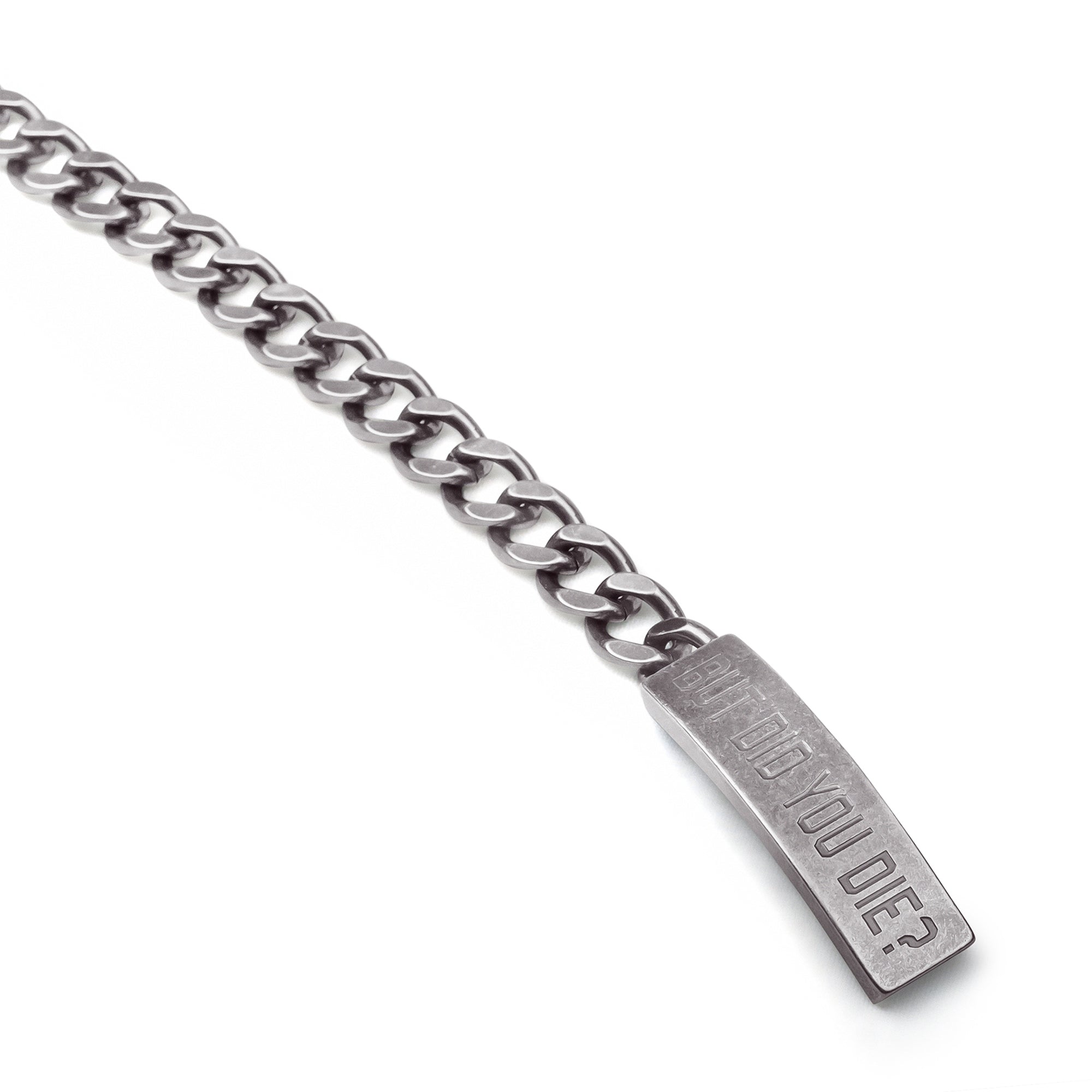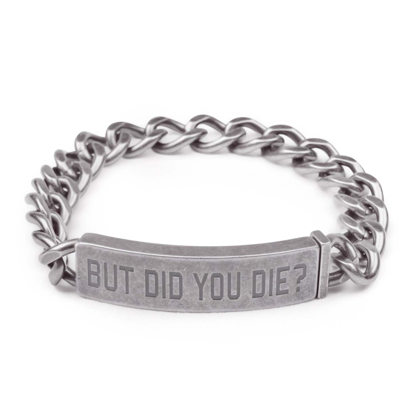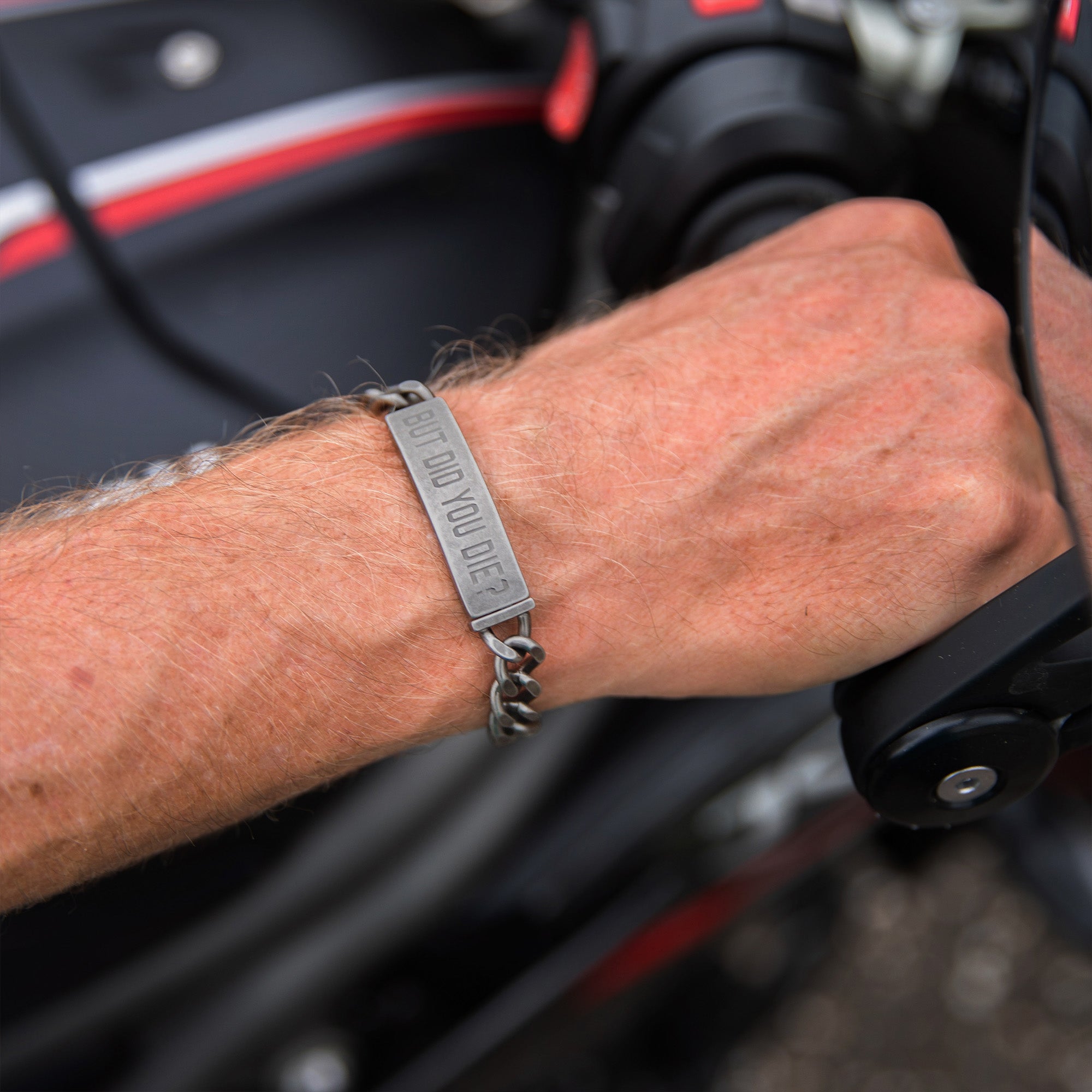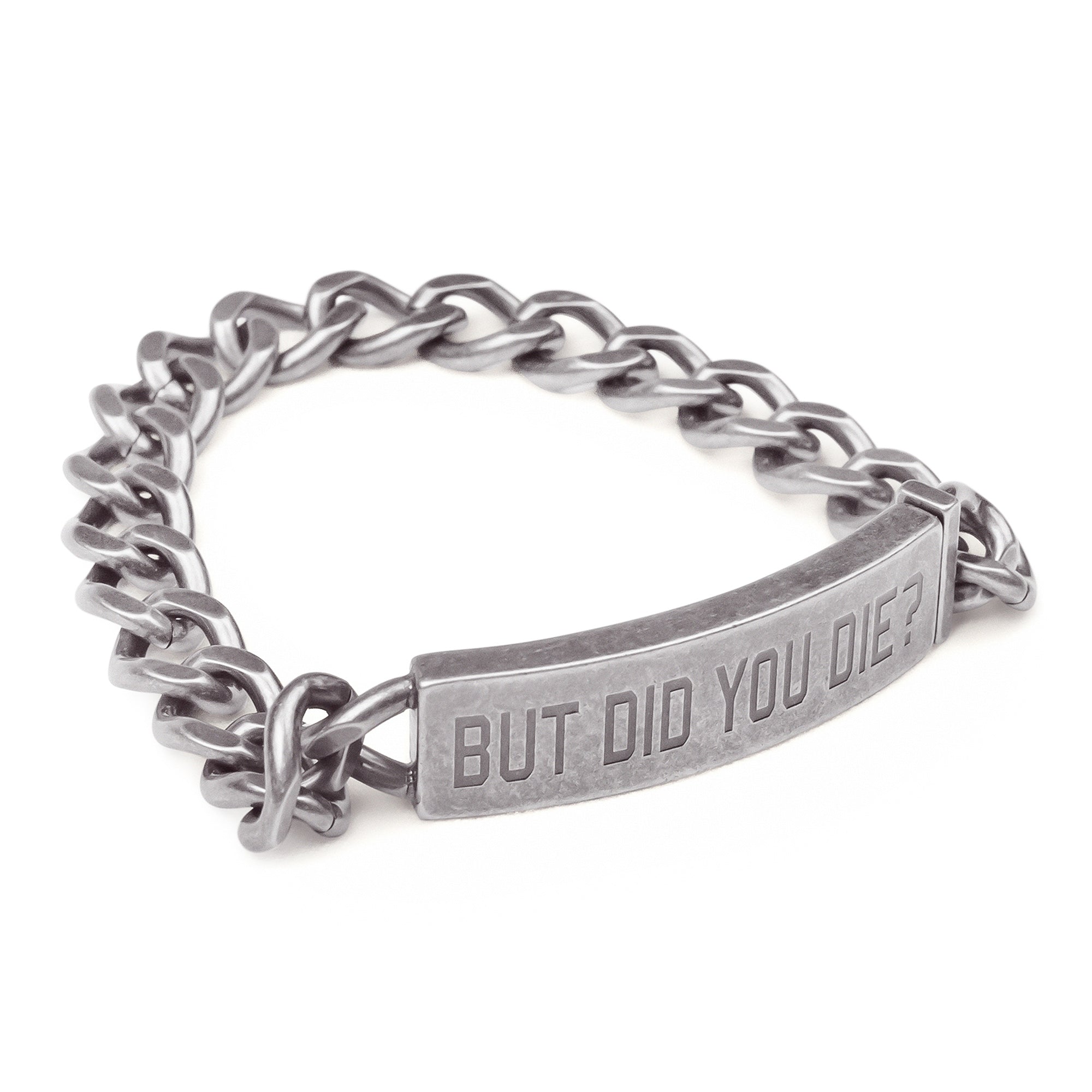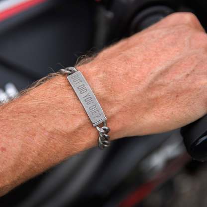 The "but did you die?" motorcycle bracelet is constructed from stainless steel and features a strong slide clip closure. This means it's durable and you won't have to worry about it accidentally opening and falling off.
