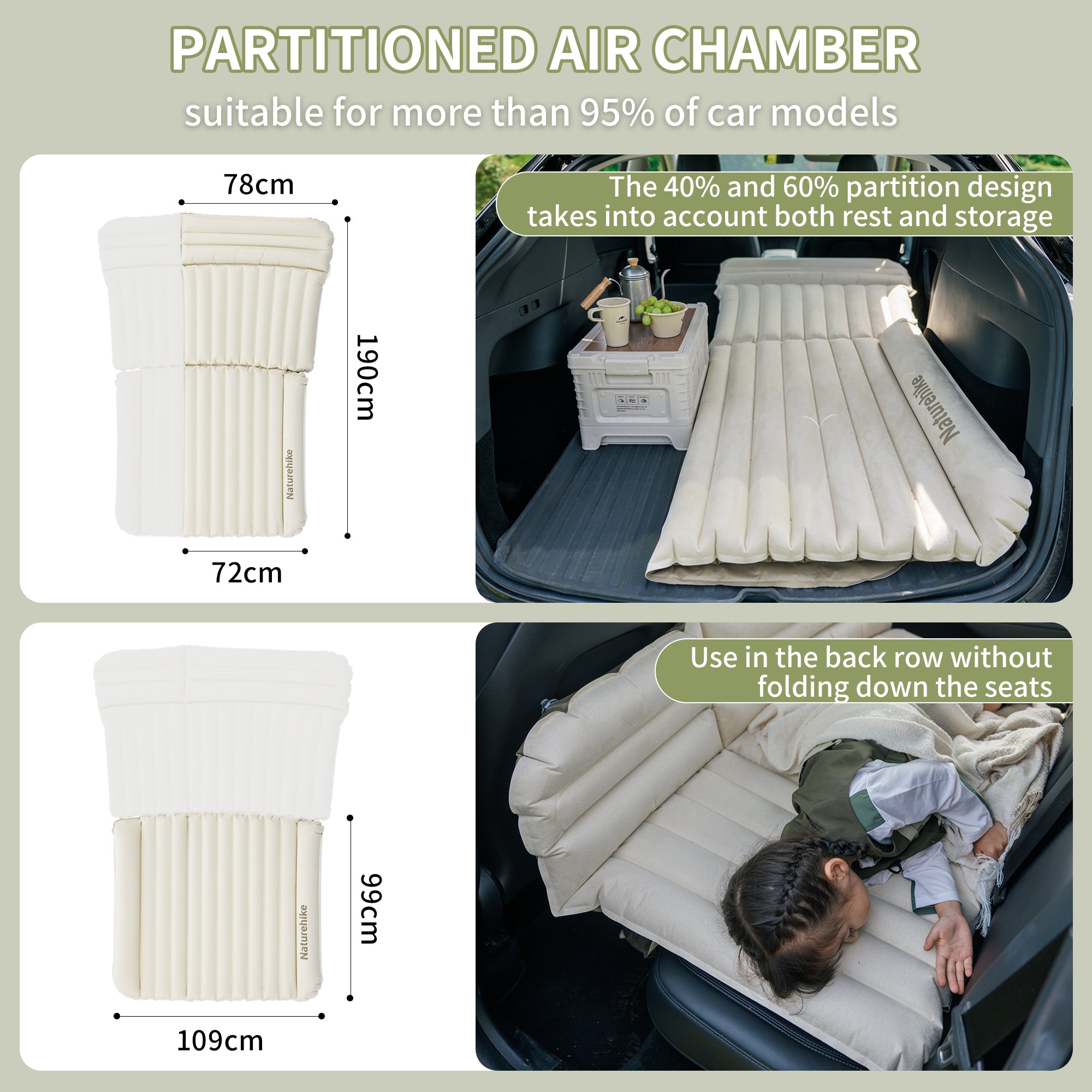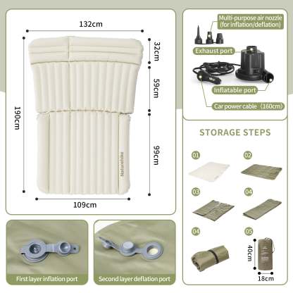 Experience ultimate comfort on your next road trip with the Naturehike Car Mounted Inflatable Bed. This ultra-lightweight cushion is made from high-quality suede TPU and Chunya Textile, ensuring durability and support while you rest. With a compact storage size of 18*40cm and an inflation size of 190*132*10cm, this bed is the perfect travel companion.