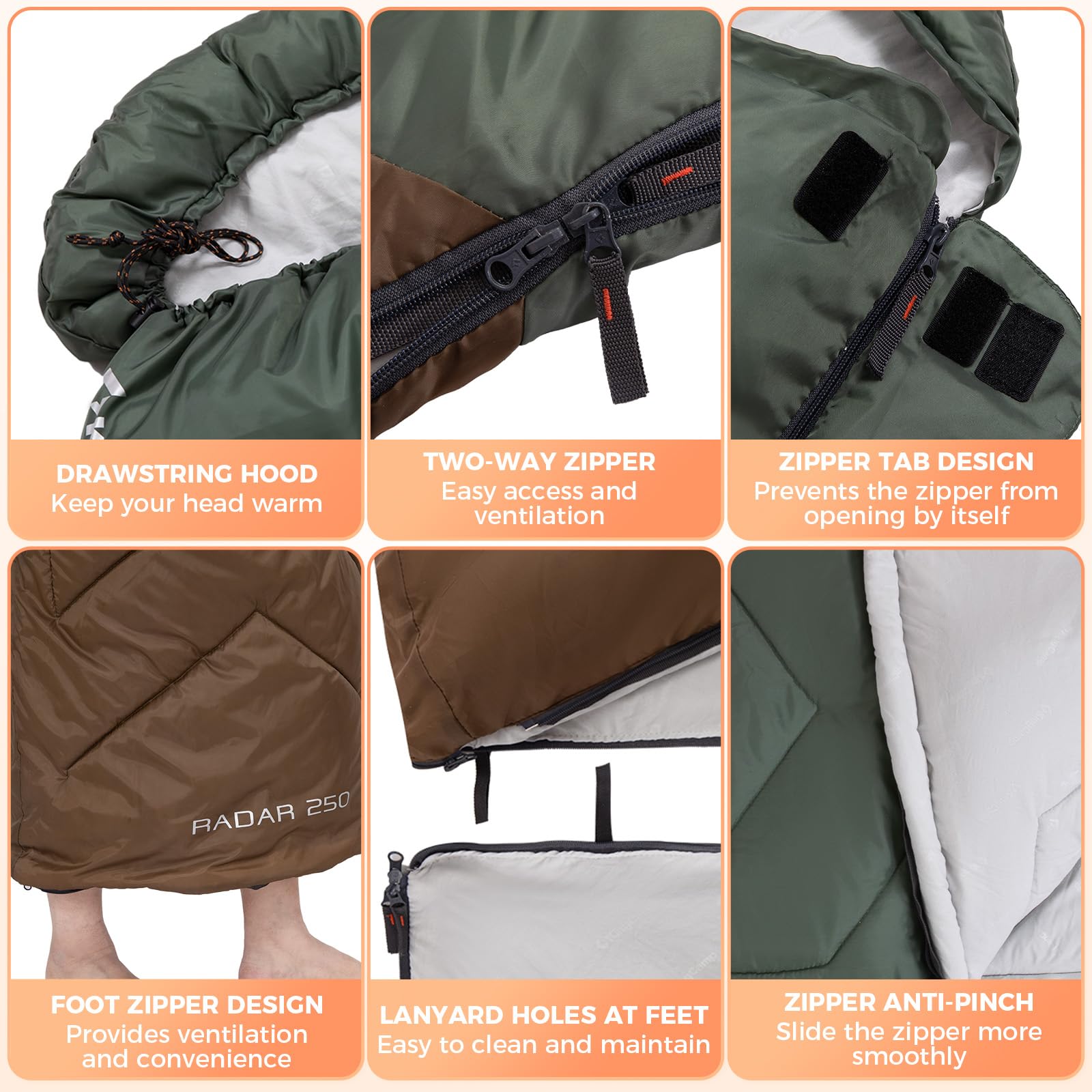 Convenient Design: Equipped with two drying straps at the bottom, cleaning and drying this sleeping bag is a breeze. The included 210D Oxford cloth compression bag makes it easy to pack and carry.