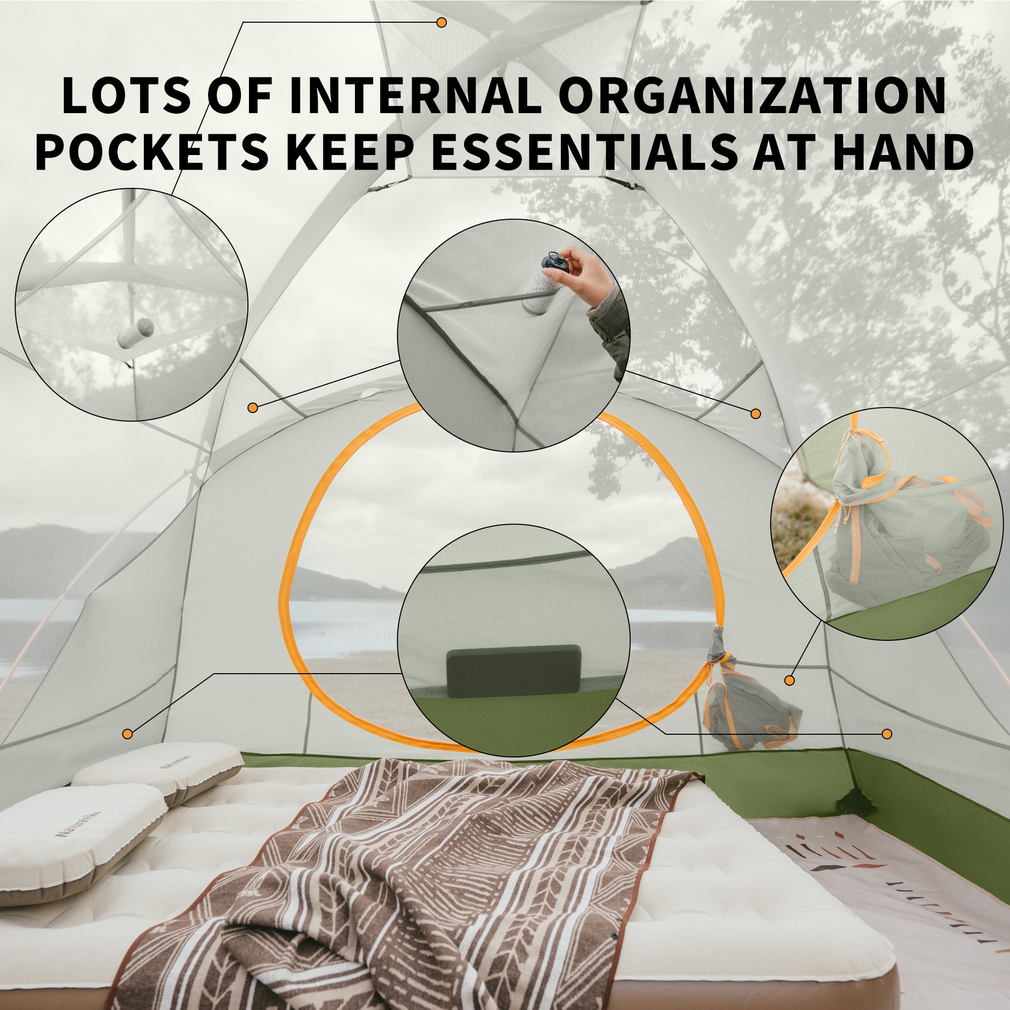 Convenient Storage: Pockets on three sides of the inner tent and hooks for hanging accessories.