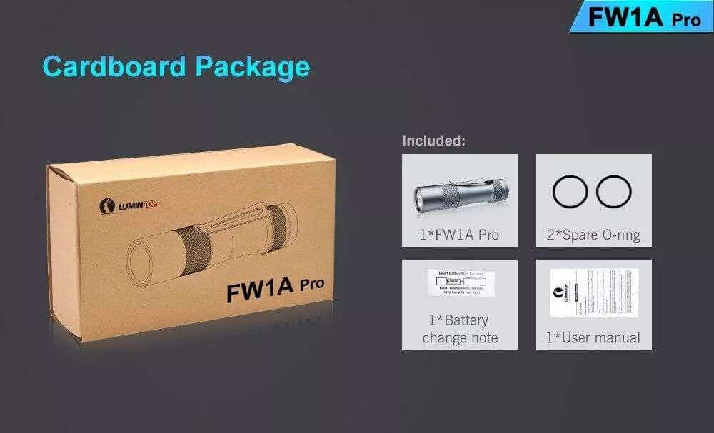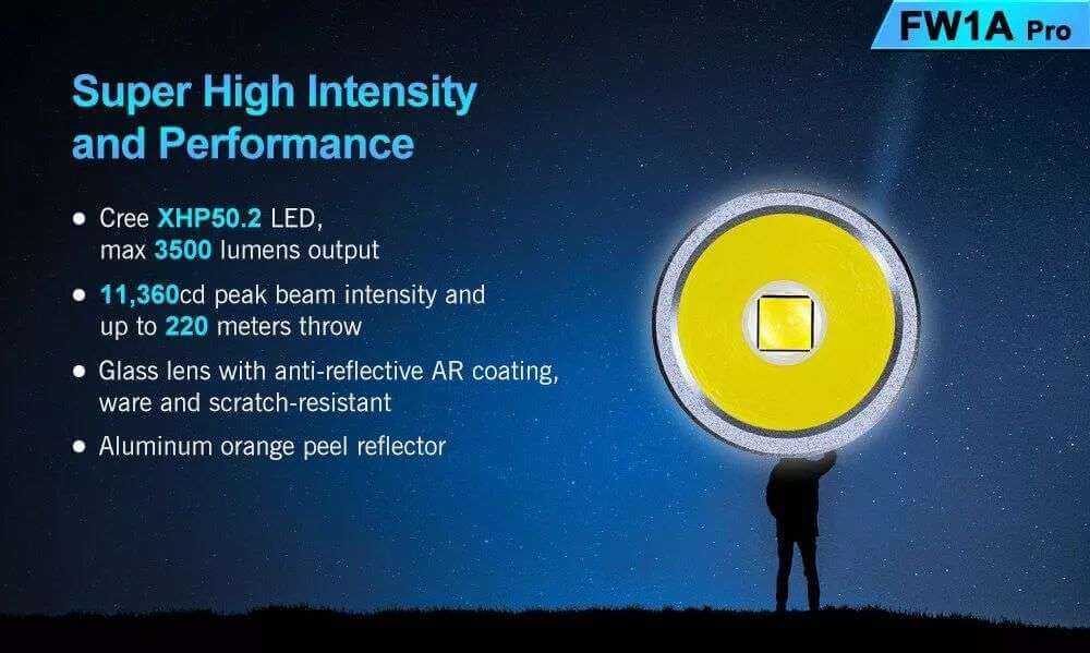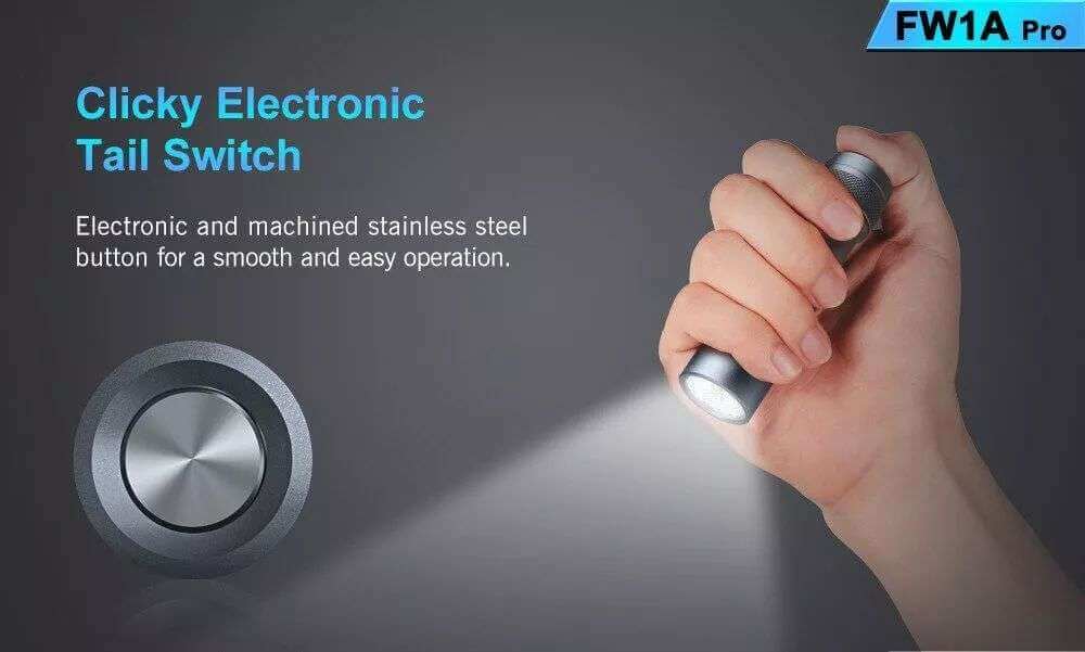FW1A Pro is a small yet ultra high-intensity flashlight that upgrades from the previous model FW1A. By adopting a high power Cree XHP50.2 LED, it delivers a max 3500 lumens output and a 220 meters beam distance by a single 18650 Li-ion battery. It uses the Anduril firmware and settings, and the stainless electronic bottom switch controls various functions including smooth ramping, stepped mode setting, strobe, etc. It is an essential compact flashlight for activities including outdoor, everyday carry, etc.