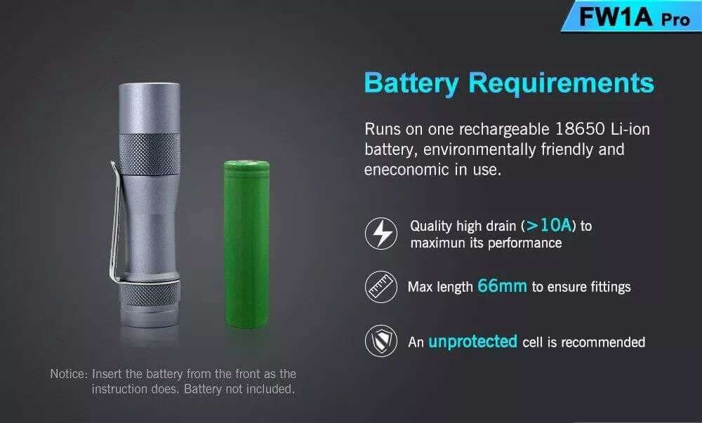 Battery: One flat-top or button top 18650 cell. An unprotected cell is recommended Max length: 66mm. cell is not included.