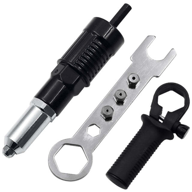 Cordless Drill Electric Rivet Gun Adapter-Professional Riveting Insert Nut Hand Tool Kit with Aluminum Casting Housing and a Non-slip Handle-4pcs Convertible Head and a Wrench.Our Rivet Gun metal Adapter have lower noise, more efficient,small size and easy to carry,universal drill attachment to easily apply nut rivet Inserts to various materials.