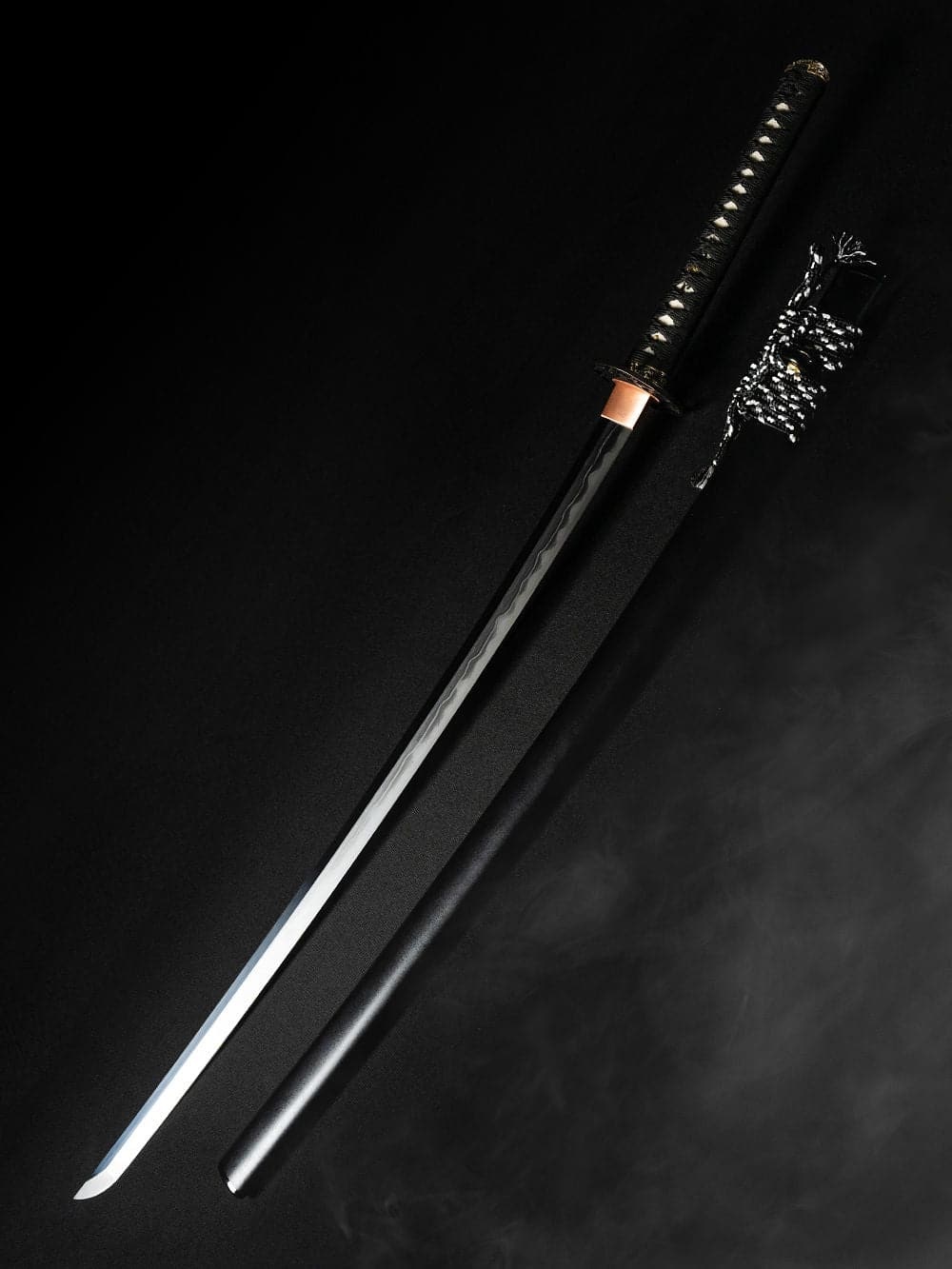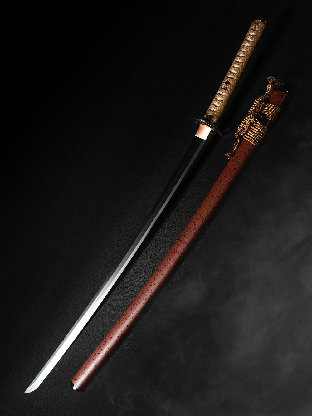 Premium Materials - The blade is made of hand-forged 1095 folded Carbon steel, which contains 0.95% carbon, making it strong and durable. The clay tempering technique creates a striking hamon and a hardened edge on the blade. The copper habaki, adds a touch of elegance to the katana, while the tsuka, crafted from genuine ray skin, provides a comfortable and authentic grip.